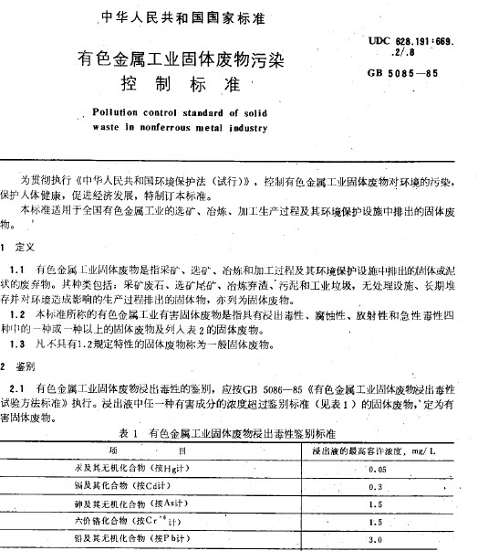 有色金屬工業(yè)固體廢棄物污染控制標準GB 5085-85