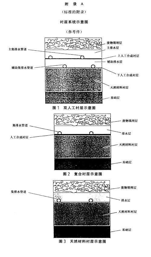 b.  人工合成材料襯層可以采用高密度聚乙烯(HDPE),其滲透系數(shù)不大于10-12cm/s,厚度不小于1.5mm。HDPE材料必須是優(yōu)質(zhì)品,禁止使用再生產(chǎn)品。 6.5.3   如果天然基礎層飽和滲透系數(shù)大于1.0×10-6cm/s,則必須選用雙人工襯層。雙人工襯層必須滿足下列條件:     a.  天然材料襯層經(jīng)機械壓實后的滲透系數(shù)不大于1.0×10-7cm/s,厚度不小于0.5m;     b.  上人工合成襯層可以采用HDPE材料,厚度不小于2.0mm;     c.  下人工合成襯層可以采用HDPE材料,厚度不小于1.0mm;     襯層要求的其它指標同第6.5.2條。 6.6   填埋場必須設置滲濾液集排水系統(tǒng)、雨水集排水系統(tǒng)和集排氣系統(tǒng)。各個系統(tǒng)在設計時采用的暴雨強度重現(xiàn)期不得低于50年。管網(wǎng)坡度不應小于2%;填埋場底部應以不小于2%的坡度坡向集排水管道。 6.7  采用天然材料襯層或復合襯層的填埋場應設滲濾液主集排水系統(tǒng),它包括底部排水層、集排水管道和集水井;主集排水系統(tǒng)的集水井用于滲濾液的收集和排出。 6.8  采用雙人工合成材料襯層的填埋場除設置滲濾液主集排水系統(tǒng)外,還應設置輔助集排水系統(tǒng),它包括底部排水層、坡面排水層、集排水管道和集水井;輔助集排水系統(tǒng)的集水井主要用作上人工合成襯層的滲漏監(jiān)測。 6.9  排水層的透水能力不應小于0.1cm/s。 6.10  填埋場應設置雨水集排水系統(tǒng),以收集、排出匯水區(qū)內(nèi)可能流向填埋區(qū)的雨水、上游雨水以及未填埋區(qū)域內(nèi)未與廢物接觸的雨水。雨水集排水系統(tǒng)排出的雨水不得與滲濾液混排。 6.11  填埋場設置集排氣系統(tǒng)以排出填埋廢物中可能產(chǎn)生的氣體。 6.12  填埋場必須設有滲濾液處理系統(tǒng),以便處理集排水系統(tǒng)排出的滲濾液。 6.13  填埋場周圍應設置綠化隔離帶,其寬度不應小于10m。 6.14  填埋場施工前應編制施工質(zhì)量保證書并獲得環(huán)境保護主管部門的批準。施工中應嚴格按照施工質(zhì)量保證書中的質(zhì)量保證程序進行。 6.15  在進行天然材料襯層施工之前,要通過現(xiàn)場施工試驗確定合適的施工機械,壓實方法、壓實控制參數(shù)及其它處理措施,以論證是否可以達到設計要求。同時在施工過程中要進行現(xiàn)場施工質(zhì)量檢驗,檢驗內(nèi)容與頻率應包括在施工設計書中。 6.16  人工合成材料襯層在鋪設時應滿足下列條件:     a.  對人工合成材料應檢查指標合格后才可鋪設,鋪設時必須平坦,無皺折;     b.  在保證質(zhì)量條件下,焊縫盡量少;     c.  在坡面上鋪設襯層,不得出現(xiàn)水平焊縫;     d.  底部襯層應避免埋設垂直穿孔的管道或其它構筑物;     e.  邊坡必須錨固,錨固形式和設計必須滿足人工合成材料的受力安全要求;     f.  邊坡與底面交界處不得設角焊縫,角焊縫不得跨過交界處。  6.17  在人工合成材料襯層在鋪設、焊接過程中和完成之后,必須通過目視,非破壞性和破壞性測試檢驗施工效果,并通過測試結果控制施工質(zhì)量。 7  填埋場運行管理要求 7.1   在填埋場投入運行之前,要制訂一個運行計劃。此計劃不但要滿足常規(guī)運行,而且要提出應急措施,以便保證填場的有效利用和環(huán)境安全。 7.2  填埋場的運行應滿足下列基本要求:     a.  入場的危險廢物必須符合本標準對廢物的入場要求;     b.  散狀廢物入場后要進行分層碾壓,每層厚度視填埋容量和場地情況而定。     c.  填埋場運行中應進行每日覆蓋,并視情況進行中間覆蓋;     d.  應保證在不同季節(jié)氣候條件下,填埋場進出口道路通暢;     e.  填埋工作面應盡可能小,使其得到及時覆蓋;     f.  廢物堆填表面要維護最小坡度,一般為1:3(垂直:水平);     g.  通向填埋場的道路應設欄桿和大門加以控制;     h.  必須設有醒目的標志牌,指示正確的交通路線。標志牌應滿足GB15562.2的要求;     ¡.  每個工作日都應有填埋場運行情況的記錄,應記錄設備工藝控制參數(shù),入場廢物來源、種類、數(shù)量,廢物填埋位置及環(huán)境監(jiān)測數(shù)據(jù)等;     j.  運行機械的功能要適應廢物壓實的要求,為了防止發(fā)生機械故障等情況,必須有備用機械;     k.  危險廢物安全填埋場的運行不能暴露在露天進行,必須有遮雨設備,以防止雨水與未進行最終覆蓋的廢物接觸;     l.  填埋場運行管理人員,應參加環(huán)保管理部門的崗位培訓,合格后上崗。 7.3  危險廢物安全填埋場分區(qū)原則 7.3.1  可以使每個填埋區(qū)能在盡量短的時間內(nèi)得到封閉。 7.3.2  使不相容的廢物分區(qū)填埋。 7.3.3  分區(qū)的順序應有利于廢物運輸和填埋。 7.4  填埋場管理單位應建立有關填埋場的全部檔案,從廢物特性、廢物傾倒部位、場址選擇、勘察、征地、設計、施工、運行管理、封場及封場管理、監(jiān)測直至驗收等全過程所形成的一切文件資料,必須按國家檔案管理條例進行整理與保管,保證完整無缺。 8  填埋場污染控制要求 8.1   嚴禁將集排水系統(tǒng)收集的滲濾液直接排放,必須對其進行處理并達到GB8978《污水綜合排放標準》中第一類污染物最高允許排放濃度的要求及第二類污染物最高允許排放濃度標準要求后