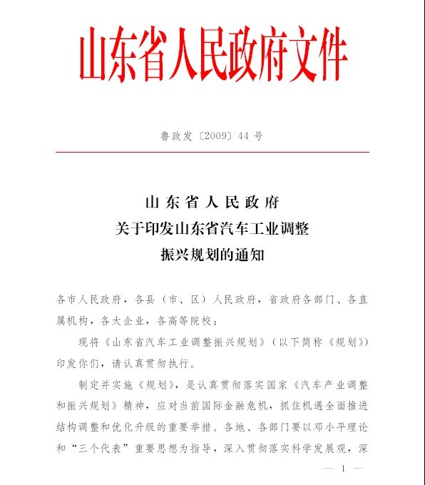 山東省汽車工業(yè)調(diào)整振興規(guī)劃 魯政發(fā)[2009]44號