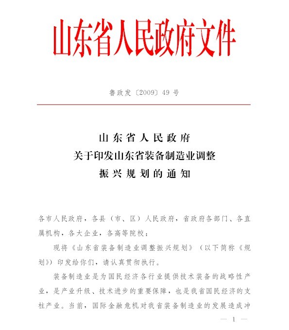 山東省裝備制造業(yè)調(diào)整振興規(guī)劃 魯政發(fā)[2009]49號(hào)